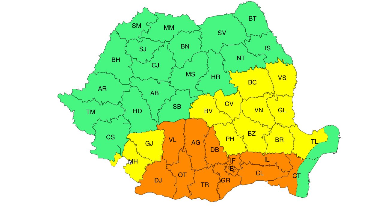 Administrația Națională de Meteorologie a emis astăzi mai multe avertizări de cod galben și cod portocaliu. Prima AVERTIZARE METEOROLOGICĂ COD GALBEN este valabilă în intervalul 27 iunie, ora 10:00 – 28 iunie, ora 10:00 și vizează: val de căldură persistent, caniculă și disconfort termic ridicat. În sud-estul Transilvaniei, jumătatea de sud a Moldovei, vestul Olteniei, nord-estul Munteniei și în nordul Dobrogei continentale, valul de căldură, canicula și disconfortul termic ridicat vor persista, iar indicele temperatură-umezeală (ITU) va depăși ușor pragul critic de 80 de unități. Temperaturile maxime vor fi cuprinse între 33 și 37 de grade, iar cele minime între 17 și 21 de grade. CODUL PORTOCALIU este valabilă în intervalul 27 iunie, ora 10:00 – 28 iunie, ora 10:00. Fenomene vizate: val de căldură persistent și intens, caniculă și disconfort termic accentuat. În cea mai mare parte a Olteniei și a Munteniei, precum și în sudul Dobrogei continentale, valul de căldură se va menține intens, va fi caniculă, disconfort termic accentuat, iar indicele temperatură-umezeală va depăși pragul critic de 80 de unități. Temperaturile maxime vor fi de 37…39 de grade, iar cele minime se vor situa între 20 și 23 de grade, caracterizând o noapte tropicală.