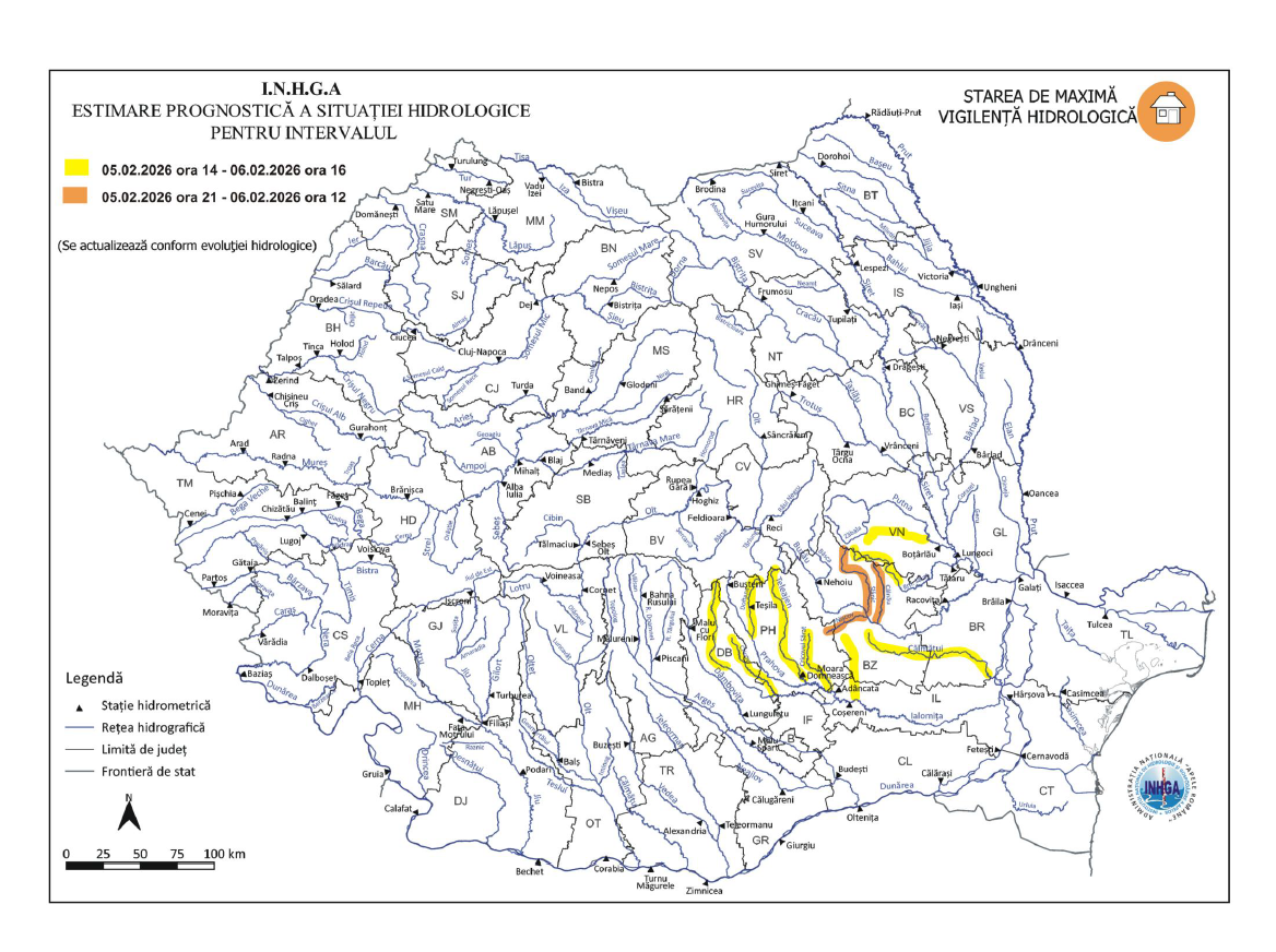 AVERTIZAREA HIDROLOGICĂ DE COD GALBEN vizează intervalul 05.02.2026 ora 14:00 – 06.02.2026 ora 16:00 pe râurile din bazinele hidrografice: Ialomiţa, Cricovul Dulce (judeţele: Dâmboviţa şi Prahova), Prahova (judeţele: Prahova şi Ialomiţa), Sărata (judeţele: Prahova, Buzău şi Ialomiţa), Călmăţui (judeţele: Buzău şi Brăila), Buzău (judeţele: Buzău şi Prahova), Râmnicu Sărat (judeţele: Buzău şi Vrancea), Putna  (judeţul Vrancea).
