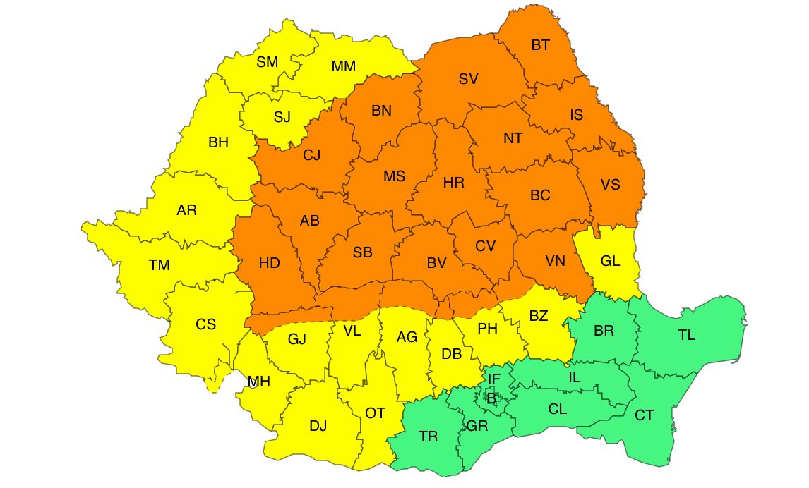 Administrația Națională de Meteorologie a emis astăzi mai multe avertizări de cod galben și cod portocaliu. Prima AVERTIZARE METEOROLOGICĂ COD GALBEN este valabilă în intervalul 27 iunie, ora 10:00 – 28 iunie, ora 10:00 și vizează: val de căldură persistent, caniculă și disconfort termic ridicat. În sud-estul Transilvaniei, jumătatea de sud a Moldovei, vestul Olteniei, nord-estul Munteniei și în nordul Dobrogei continentale, valul de căldură, canicula și disconfortul termic ridicat vor persista, iar indicele temperatură-umezeală (ITU) va depăși ușor pragul critic de 80 de unități. Temperaturile maxime vor fi cuprinse între 33 și 37 de grade, iar cele minime între 17 și 21 de grade. CODUL PORTOCALIU este valabilă în intervalul 27 iunie, ora 10:00 – 28 iunie, ora 10:00. Fenomene vizate: val de căldură persistent și intens, caniculă și disconfort termic accentuat. În cea mai mare parte a Olteniei și a Munteniei, precum și în sudul Dobrogei continentale, valul de căldură se va menține intens, va fi caniculă, disconfort termic accentuat, iar indicele temperatură-umezeală va depăși pragul critic de 80 de unități. Temperaturile maxime vor fi de 37…39 de grade, iar cele minime se vor situa între 20 și 23 de grade, caracterizând o noapte tropicală.