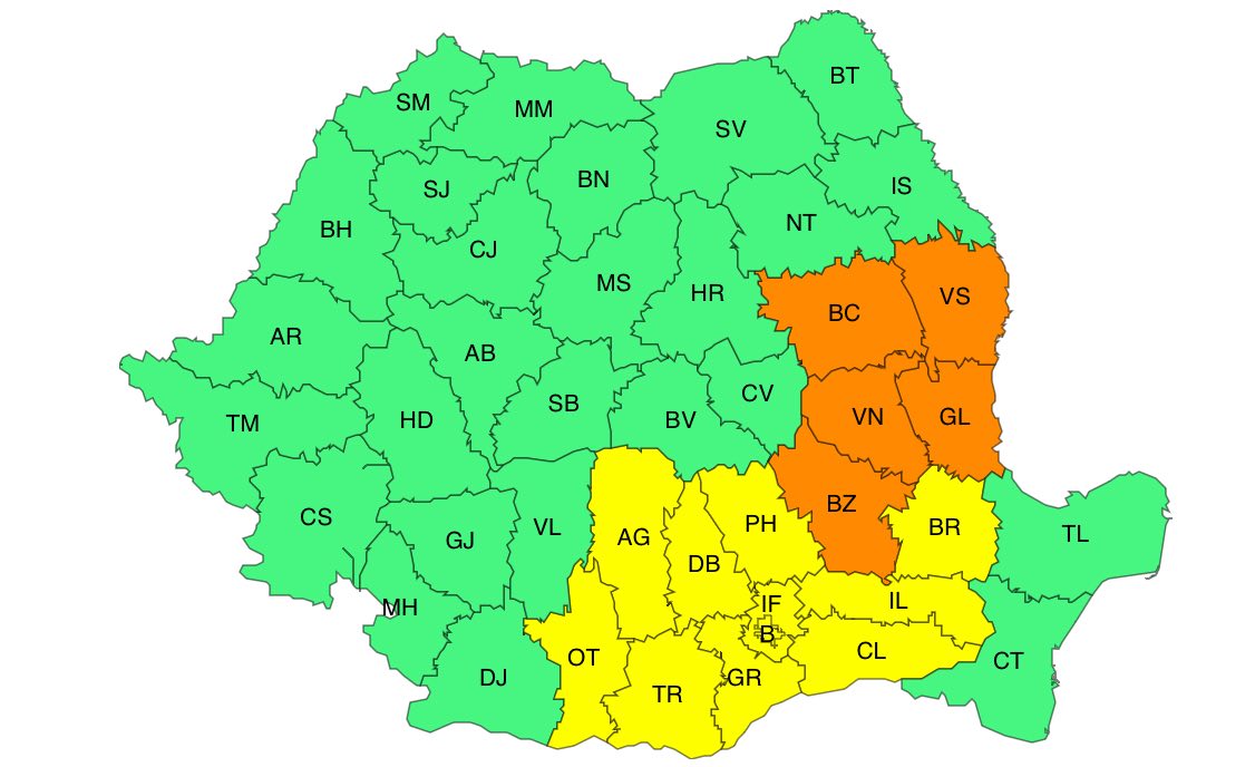 O altă AVERTIZARE METEOROLOGICĂ COD GALBEN este valabilă în intervalul: 27 iunie, ora 19:00 – 28 iunie, ora 04:00 și vizează instabilitate atmosferică. În Muntenia, sud-estul Olteniei și jumătatea sudică a Moldovei vor fi perioade cu instabilitate atmosferică. Aceasta se va manifesta prin intensificări ale vântului și vijelii (rafale în general de 60…70 km/h), averse torențiale, descărcări electrice și grindină. În intervale scurte de timp sau prin acumulare, cantitățile de apă vor fi de 20…25 l/mp, iar pe arii restrânse vor depăși 40 l/mp. CODUL PORTOCALIU este valabil pentru intervalul 27 iunie, ora 19:00 – 27 iunie, ora 22:00. Fenomenele vizate sunt: instabilitate atmosferică accentuată. În jumătatea sudică a Moldovei și nord-estul Munteniei vor fi vijelii puternice (viteze ale vântului de 70…90 km/h), grindină de medii și mari dimensiuni, frecvente descărcări electrice și averse torențiale. În intervale scurte de timp (1-3 ore), cantitățile de apă vor fi de 25…40 l/mp, iar pe arii restrânse vor depăși 50 l/mp. În funcţie de evoluţia şi intensitatea fenomenelor meteorologice, Administraţia Naţională de Meteorologie va actualiza prezentul mesaj.