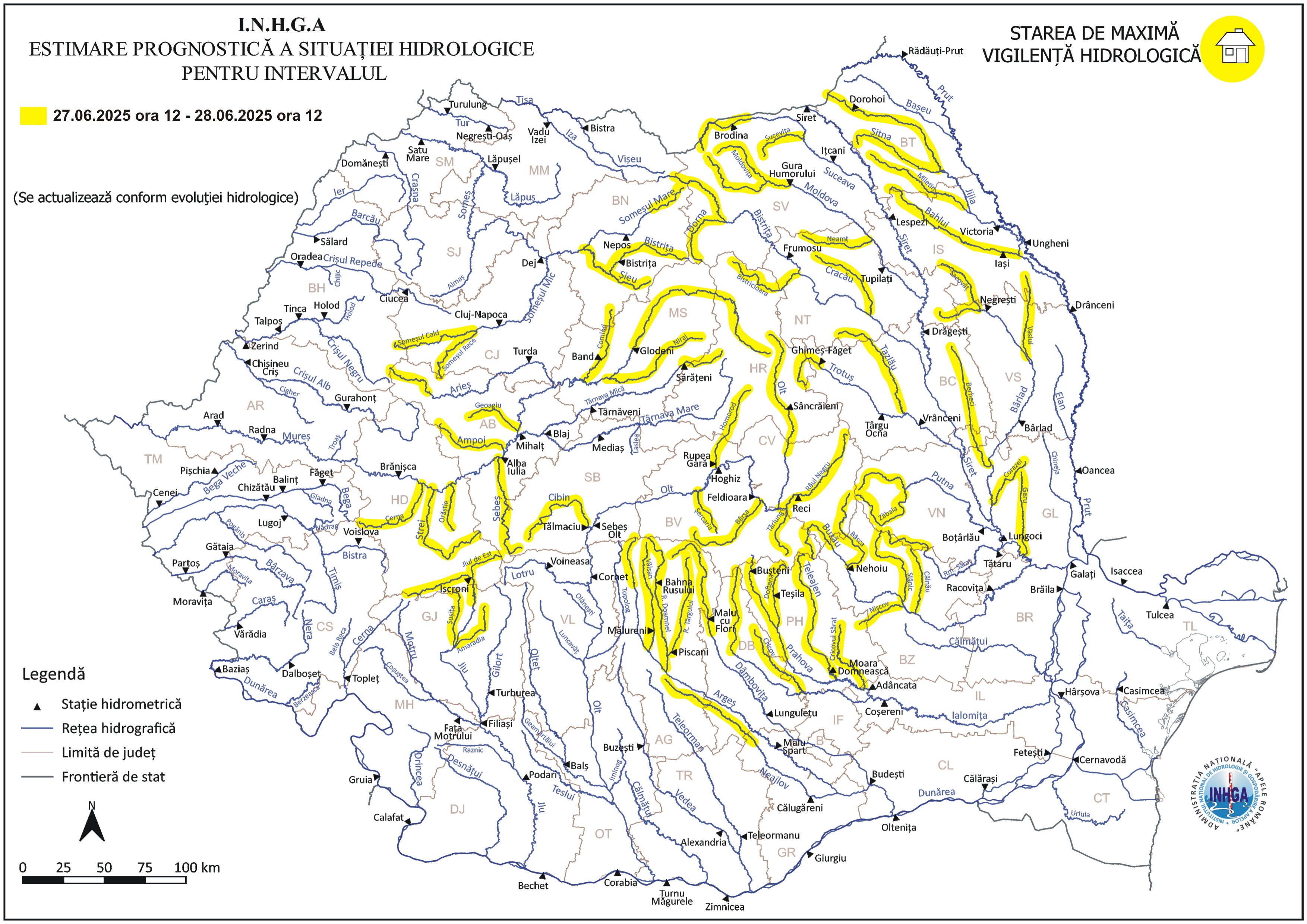 Atenționarea hidrologică este valabilă în intervalul: 27 iunie, ora 12:00 – 28 iunie, ora 12:00 și vizează în principal fenomenele de scurgeri importante pe versanţi, torenţi şi pâraie, viituri rapide pe râurile mici cu posibile efecte de inundaţii locale, care se pot produce cu probabilitate și intensitate mai mare pe unele râuri mici din judeţele: Cluj, Alba, Hunedoara, Braşov, Suceava, Neamţ şi Bacău.