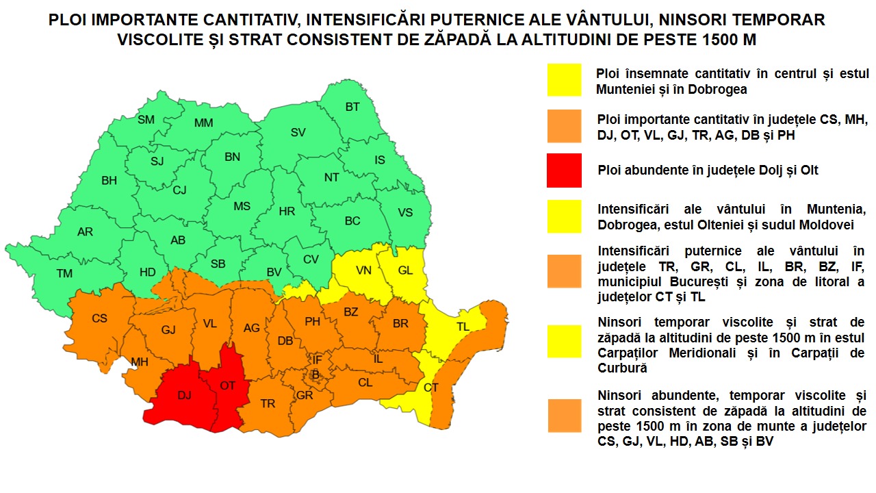 - COD ROȘU – 2 octombrie (ora 18:00) – 3 octombrie (ora 21:00). În județele Dolj și Olt va ploua abundent și se vor cumula cantități de apă de 100…110 l/mp.