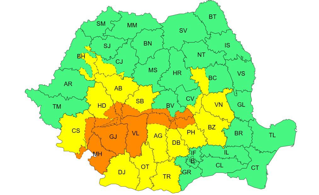 În intervalul 28.03.2025, ora 18:00 – 29.03.2025, ora 15:00, pe râurile din bazinele hidrografice: Cerna – bazin superior şi afluenţi bazin mijlociu şi inferior (judeţele Gorj şi Caraş Severin), Dunăre – afluenţii mici aferenţi sectorului amonte S.H. Calafat (judeţele: Caraş Severin, Mehedinţi şi Dolj), Jiu – afluenţii aferenţi sectorului aval S.H. Sadu – amonte S.H. Rovinari (judeţul Gorj), Motru – bazin amonte S.H. Broşteni şi afluenţii aferenţi sectorului aval S.H. Broşteni (judeţele: Gorj şi Mehedinţi), Gilort – bazin amonte S.H. Târgu Cӑrbuneşti şi afluenţii aferenţi sectorului aval S.H. Târgu Cӑrbuneşti (judeţul Gorj), Olt – afluenţii aferenţi sectorului aval confluenţă cu râul Cibin – amonte Acumularea Ionești (judeţele: Sibiu, Vâlcea și Argeş), Olteţ – bazin superior și afluenţi bazin mijlociu (judeţele: Gorj și Vâlcea).