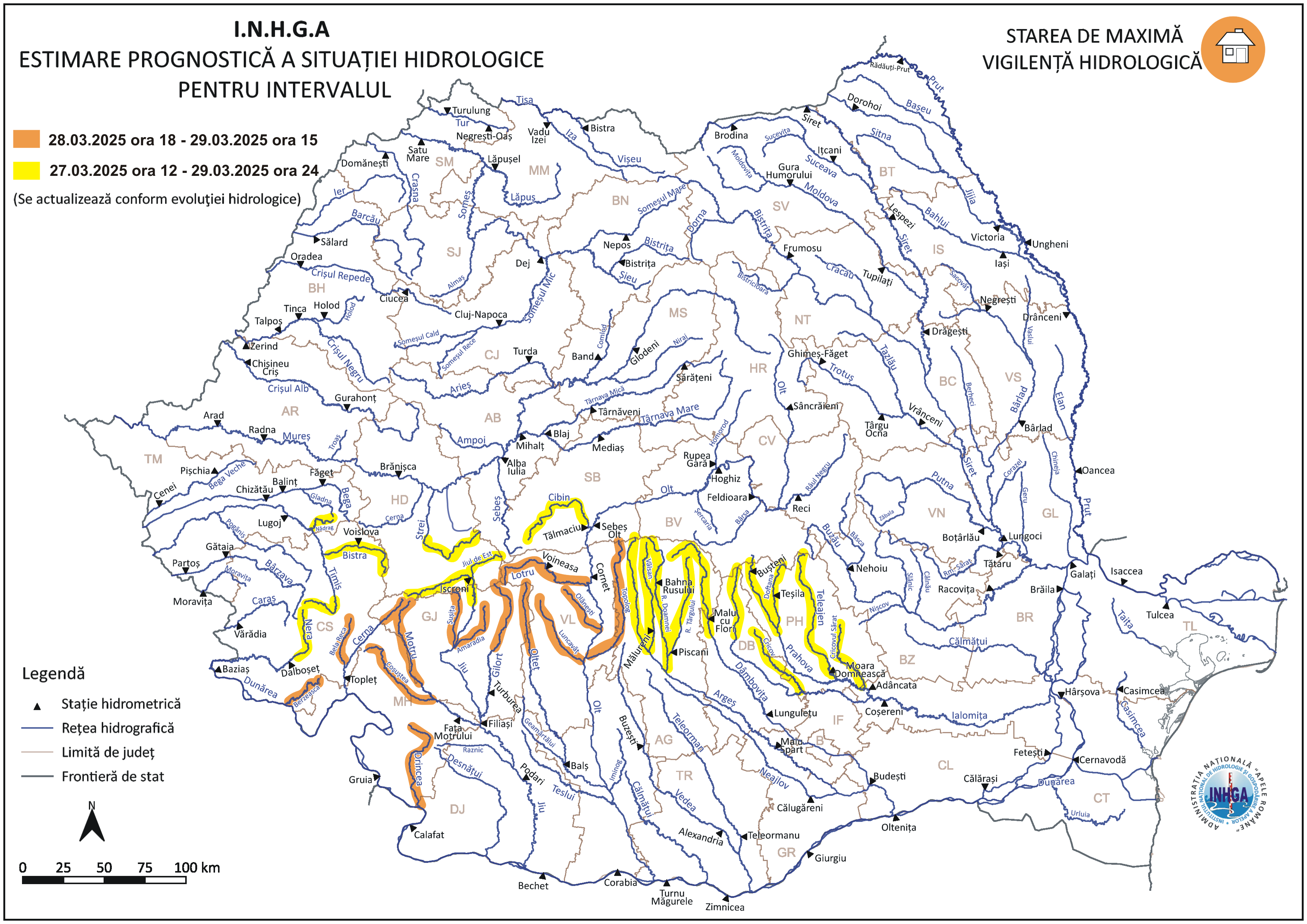 În intervalul 27.03.2025 ora 12:00 – 29.03.2025, ora 24:00, pe râurile din bazinele hidrografice: Strei (afluent al Mureşului) – bazin superior și afluenţi bazin mijlociu (judeţul Hunedoara), Timiş – bazin amonte S.H. Sadova şi afluenţii aferenţi sectorului aval S.H. Sadova – amonte S.H. Lugoj (judeţele: Caraş Severin şi Timiş), Nera – bazin superior și afluenţi bazin mijlociu și inferior (judeţul Caraş Severin), Cerna – bazin superior şi afluenţi bazin mijlociu şi inferior (judeţele Gorj şi Caraş Severin), Dunăre – afluenţii mici aferenţi sectorului amonte S.H. Calafat (judeţele: Caraş Severin, Mehedinţi şi Dolj), Jiu – bazin amonte S.H. Sadu şi afluenţii aferenţi sectorului aval S.H. Sadu – amonte confluenţă cu râul Gilort (judeţele: Hunedoara şi Gorj), Motru – bazin amonte S.H. Broşteni şi afluenţii aferenţi sectorului aval S.H. Broşteni (judeţele: Gorj şi Mehedinţi), Gilort – bazin amonte S.H. Târgu Cӑrbuneşti şi afluenţii aferenţi sectorului aval S.H. Târgu Cӑrbuneşti (judeţul Gorj), Olt – afluenţii aferenţi sectorului aval confluenţă cu râul Cibin – amonte Acumularea Ionești (judeţele Sibiu, Vâlcea și Argeş), Olteţ – bazin superior și afluenţi bazin mijlociu (judeţele Gorj și Vâlcea), Argeş – bazin superior (judeţul Argeş).